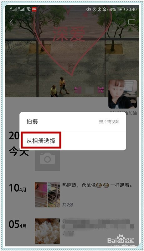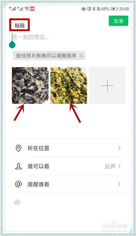 从相册中选择图片,就选适才保留的图片,再点击粘贴适才复制的她的朋友圈的文字。如图所示。