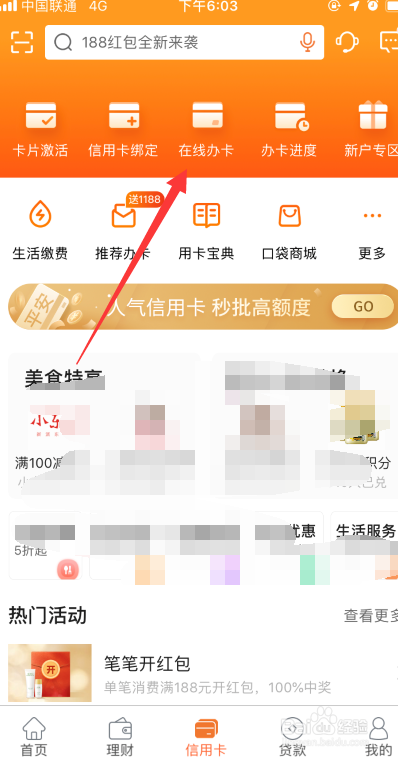进入信用卡页面后,如下图所示,在页面中找到在线办卡进口即可。