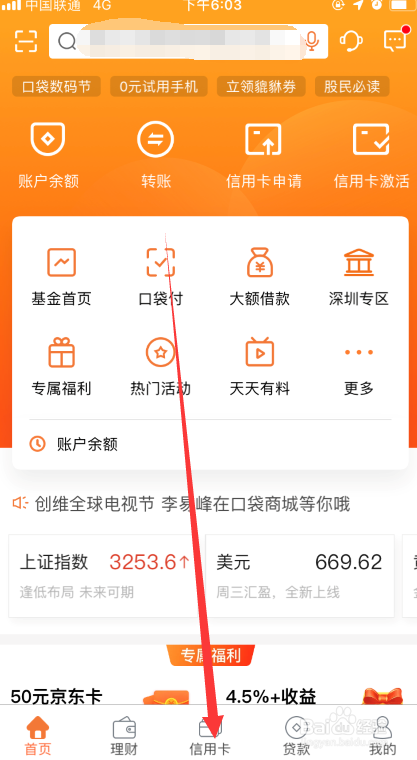 接下来系统跳转到首页页面,在页面中找到信用卡进口,如下图红标位置所示。