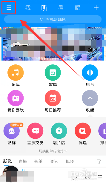 点击酷狗音乐,进入软件界面,点击左上边三的图标,如图所示
