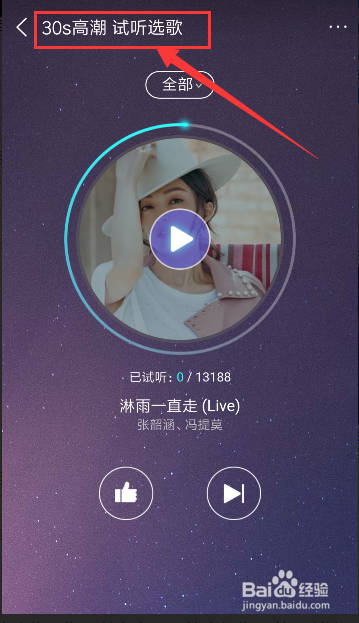 点击飞腾挑歌,来到30s飞腾试听选歌,这个页面,点击试听歌曲,如图所示