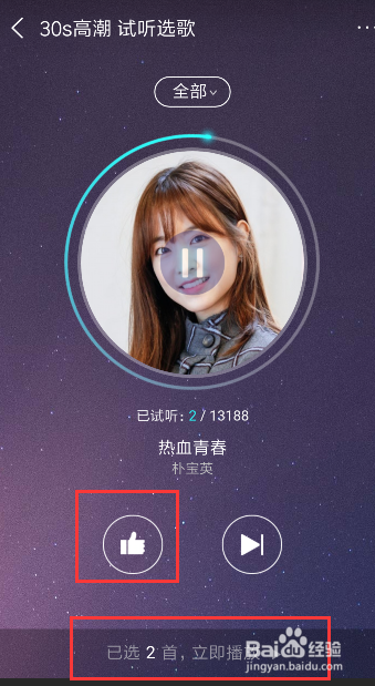 若是你喜好某首歌曲,你可以点击下面的大拇指,就可以拔取歌曲了