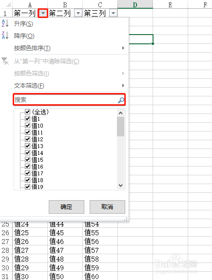点击excel内容题目右侧的下拉箭头,可以弹出一个对话框,这个界面有一个【搜刮】框,当行记实不多的时辰,可以直接在此处过滤,速度也良多。可是,当行记实跨越几万、十万的时辰,这样搜刮就很慢