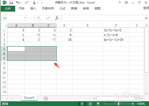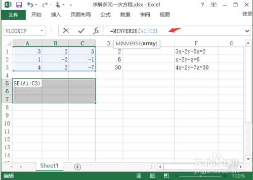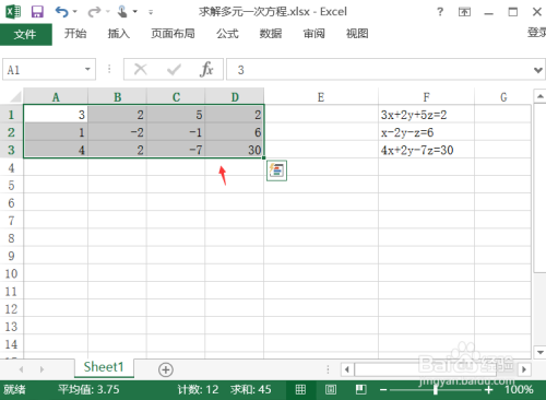 然后把需要求解的多元一次方程,按照系数的摆列挨次写入表格,字母符号就不消写进去了,好比我们求解开首图里面那个方程,字母挨次从左到右,依次是x,y,z摆列,从A1一向写到C3单位格,D1-D3列单位格对应放置等号右边的纯数字成果,注重系数要带正负号哦: