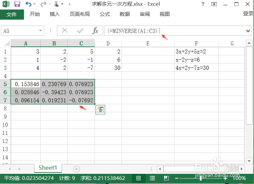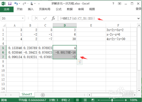 最后把鼠标选中D5至D7的三个单位格,用来别离存放x,y,z这三个未知元的最终解。同样的操作,光标移动到插入函数东西栏,输入“=MMULT(A5:C7,D1:D3)”,此中A5:C7是适才求出来的逆矩阵系数单位格规模,D1:D3是原始多元一次方程等号右边的数值解单位格规模。然后鼠标不要再动,直接用手按住键盘的以下组合键:ctrl+shift+enter,就可以看到从D5到D7生当作了一个响应的方程组的解成果,也就是x=4,y=-8.88178E-16,z=-2,此中y=-8.88178E-16是一个很是小的数,这是因为EXCEL单位格数值格局的精渡过高所致,一般可以当做y=0处置。