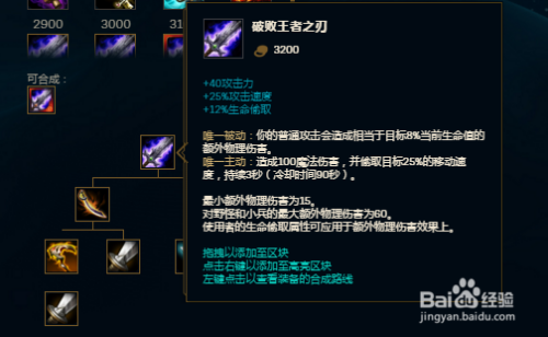 在出完打野刀和鞋子之后就可以出破败,破败不仅有着吸血结果,并且其增添的攻速和被动都完美适合剑圣,是剑圣的焦点输出装之一。