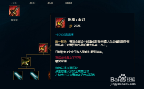 打野刀的选择是红色打野刀,附魔选择的是血刃,剑圣对攻速的需求弘远于进犯力,并且红色打野刀造当作的危险也是最高的。