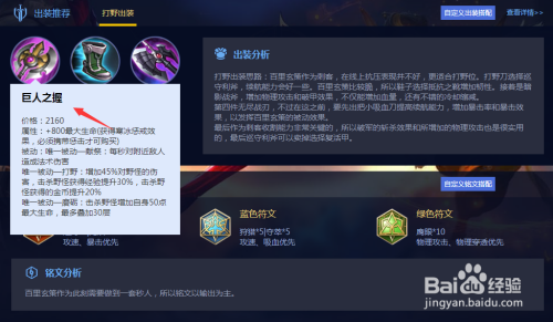 首先我们可以给百里玄策出巨人之握,巨人之握能供给献祭的被动结果每秒对四周仇敌造当作危险。