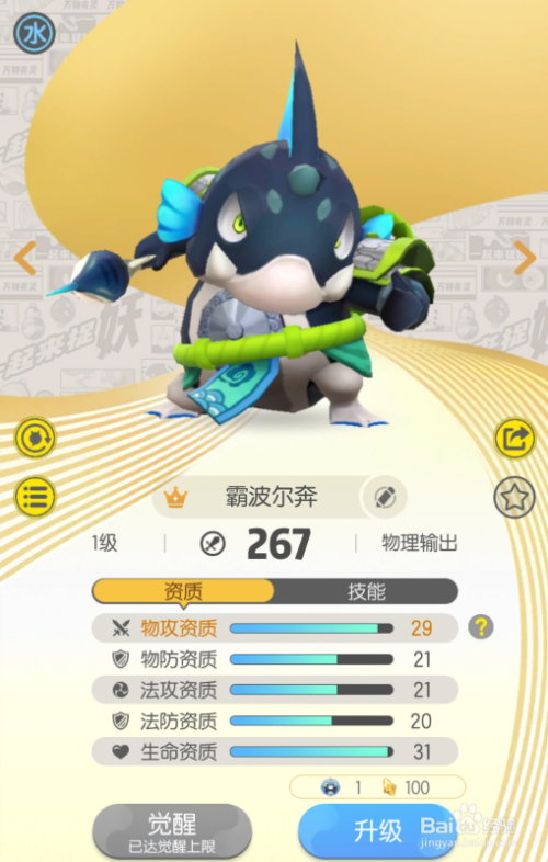 霸波尔奔是水属性的妖灵,并且我们是经由过程2KM的灵石打开的,一般来说灵石开出来的妖灵都是不错的。