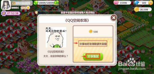 分享当作功后获得额外的500金币的奖励,点击确定领取;