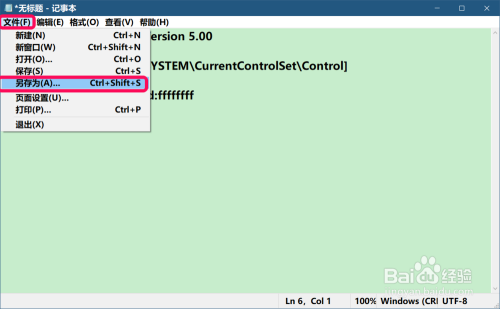 点击记事本左上角的【文件】,鄙人拉菜单中点击【另存为】或 按下键盘上的Ctrl+Shift+S组合键,打开另存为窗口;