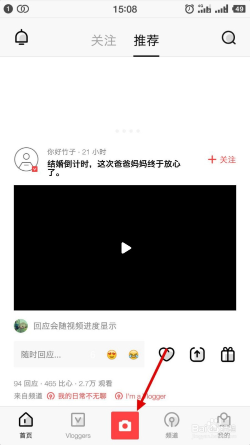 进入VUE视频本家儿界面后,我们点击底部导航中的相机按钮。