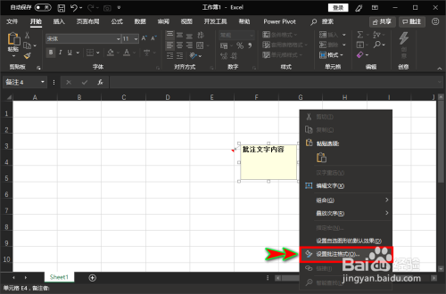 新建一个注释或者批注后,我们零丁选中批注的边框,然后点击鼠标右键,选择右键菜单中的“设置批注格局”选项。