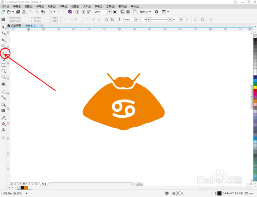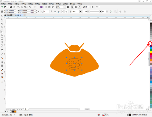 点击【选择东西】,选中整个身体部门图案,鼠标左键点击右边色板中的橘色色块,将其填充为橘色。点击【钢笔东西】绘制出巨蟹座符号后,鼠标左键点击色板中的白色,将符号填充为白色。最后,选中整个图案,鼠标右键点击色板中的×,去除图案描边(如图所示);