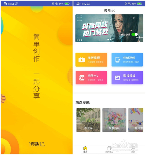 首先我们下载传影记,这是一条目建造视频和海报的东西类软件。打开首页,可以看到有四种分歧的功能,建造壁纸的话只需要海报功能。
