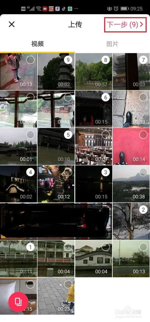 选择九个要上传的视频,在视频右上角进行勾选,选完之后,点击右上角的下一步;