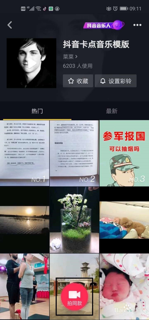 进入卡点音乐模板界面,该界面可以看到该音乐下的热点视频,我们点击最下方的“拍同条目”;
