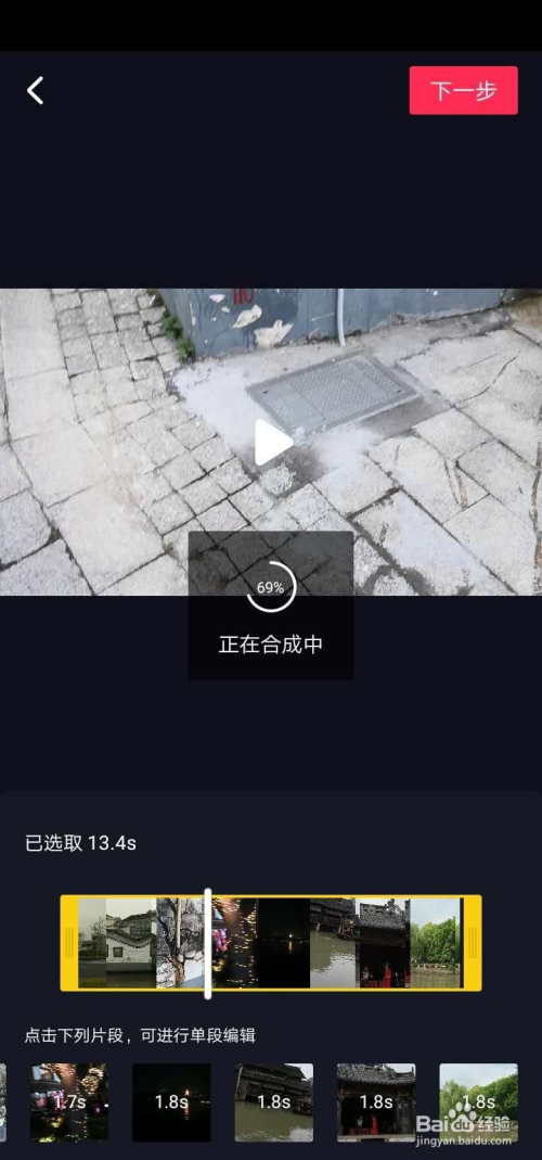 进入视频编纂界面,调整每个视频的时候:第一条1秒;第二条1.8秒,第三条1.9秒;第四条1.7秒;第五条到第七条1.8秒,第八条到第九条1.7秒;设置完当作后,点击下一步;
