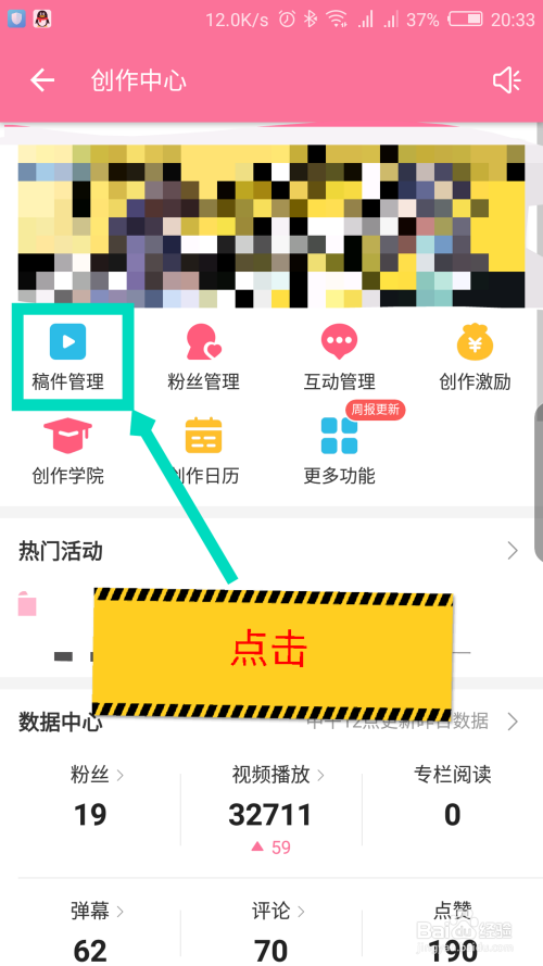 在打开的创作中间里面,点击稿件办理选项。