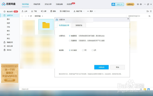 也可以点击“我的网盘”,点击此中一个文件右击选择“分享”,弹出界面可以选择“私密毗连分享”,分享体例分为“有提取码”,“有提取码”是系统随机给的分享时需要输入“该提取码”,无提取码不需要输入该提取码就可以点开了,还可以设置有用期是永远仍是7天有用,或者1天都可以选择设置.