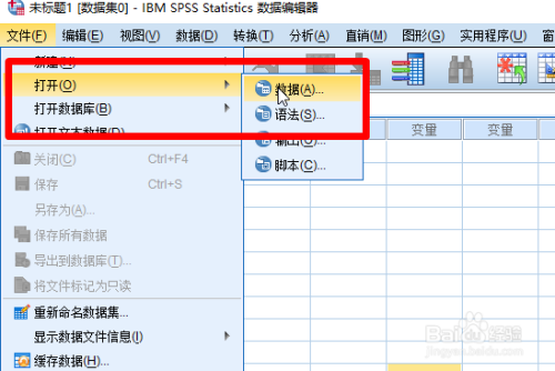 首先打开【SPSS软件】,然后在菜单栏中点击【文件-打开-数据】,接着打开一份要进行绘制散点图的数据样本