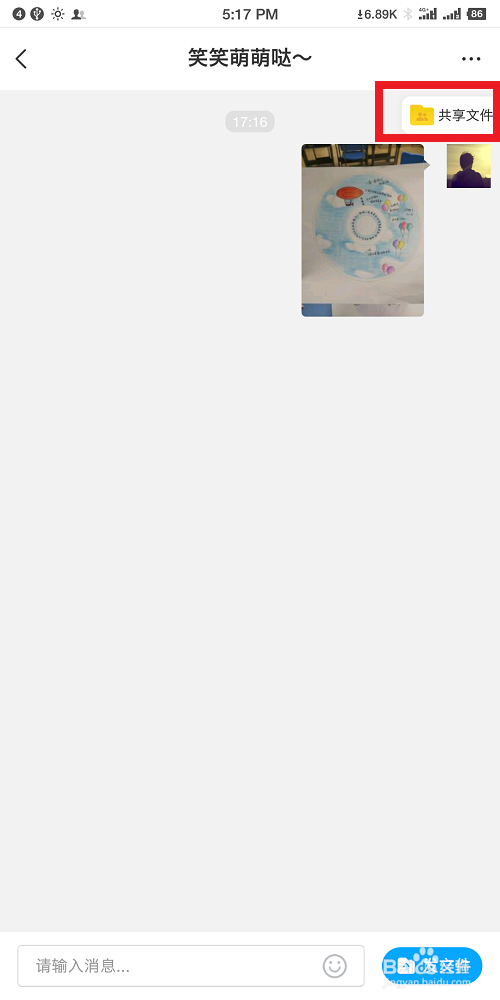 然后我们就会进入到和这个老友的聊天界面之中。在这个界面里,我们需要把目光往右上角看去,可以发此刻这里有一个小浮窗,上面写着四个字,共享文件,我们点击它。