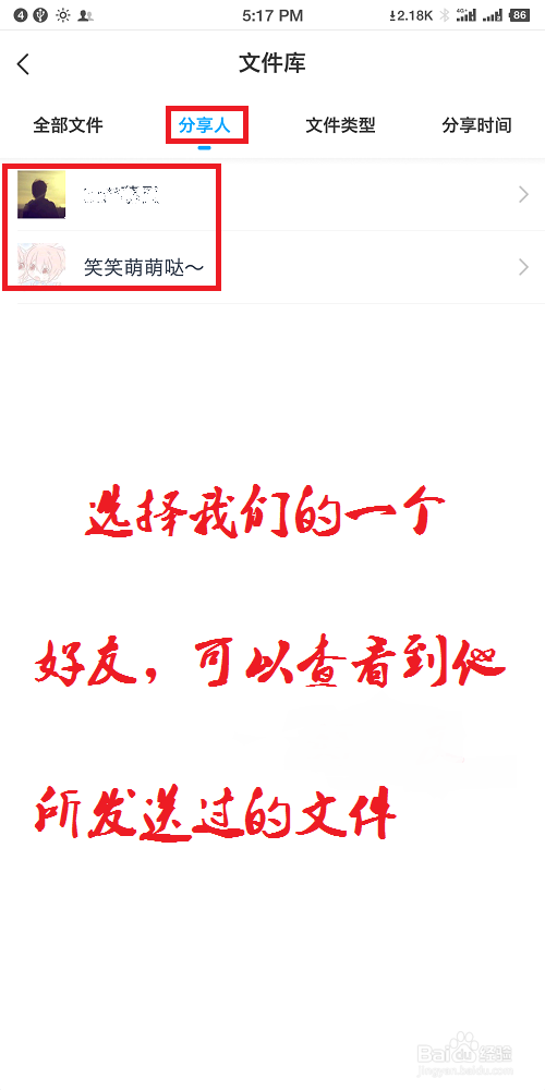 接着我们就会进入到和洽友分享文件的文件库之中。在文件库里,我们可以选择分享人,而且点击老友的头像,这样子就可以查看到所有老友分享给我们的文件。
