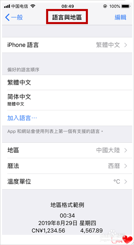 打开说话与地域后,今朝的设置是繁体字,如图所示。