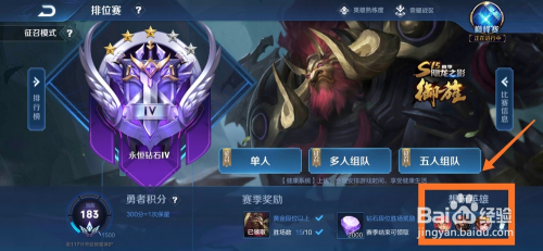 点击方框中的“排位赛”按钮,进入游戏的排位赛页面,排位赛页面可以设置想玩英雄。