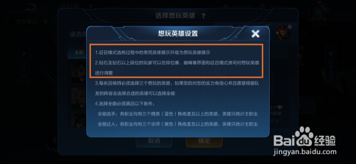 先来看一下想玩英雄的介绍吧,点击箭头处问号即可查看。钻石及钻石以上段位的呼唤师可以在排位赛界面设置本身的想玩英雄。
