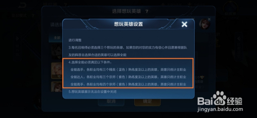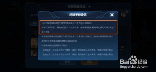 点击“选择想玩英雄”右边的“?”号,查看设置详情。征兆模式把常用英雄展示进级为想玩英雄,钻石及以上的玩家可以对想玩英雄进行调整。