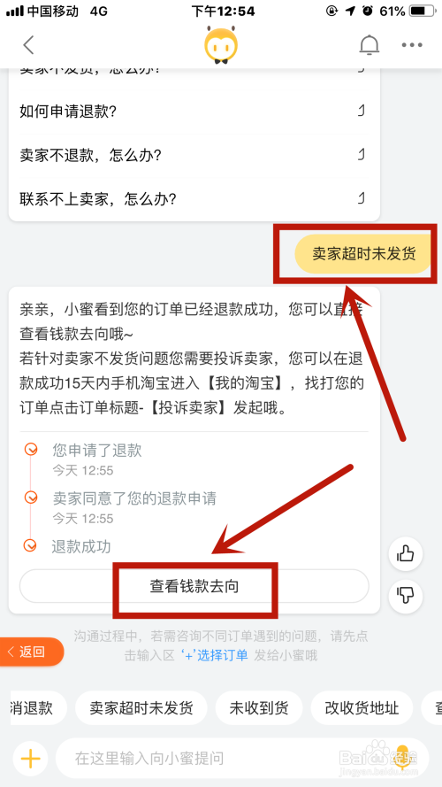 点击下方的【卖家超市未发货】,这时辰小蜜就会直接给你一个解决方案,例如投诉卖家、申请退条目等等