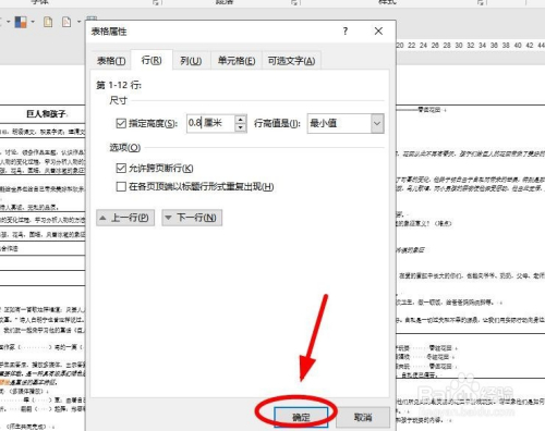 在“表格属性”对话框中,单击“行”选项卡