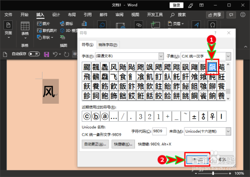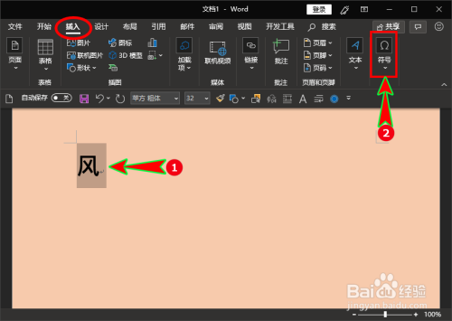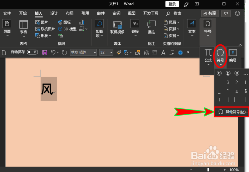 接着我们选中输入的偏旁或部首(选中风),再单击本家儿菜单中的“插入”选项,在其下拉菜单中找到“符号”并单击。如图所示: