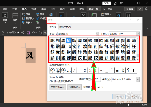 这时我们会发现弹出的“符号”对话窗界面中呈现了良多与“风”字相关的汉字(即与适才输入偏旁部辅弼关的汉字)。如图所示: