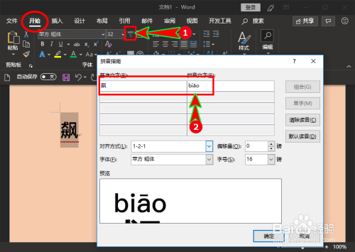- 生僻字插入到文档后,我们操纵拼音指南功能能轻松知道该字怎么读。