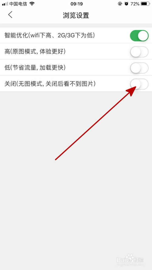 在“游览设置”页面中按照本身的需要封闭“无图模式”,封闭此开关后就看不到图片了。如下图