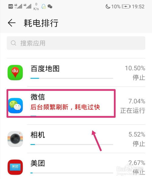 点击后可以看到,华为手机耗电应用的排行环境,点击需要封闭的耗电应用进入。