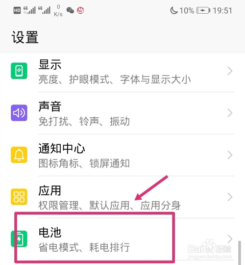 在手机的设置列表中,选择电池的选项进入。