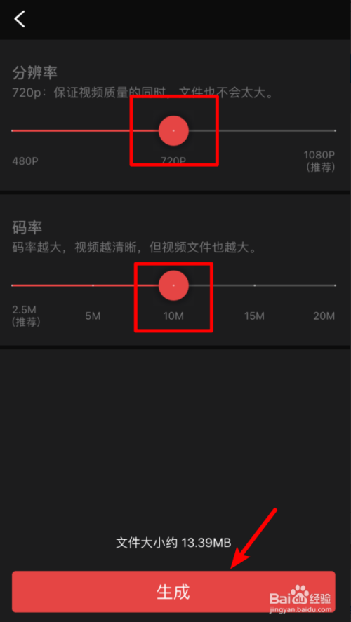 点击后,在设置界面,经由过程拖动分辩率和码率,就可以调整视频的分辩率和大小。调整后,点击生当作的选项。