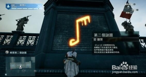 3、按照谜题内容,猜测第一谜题谜底应在市政厅西面。最后可在西面高处的墙上找到谜底。