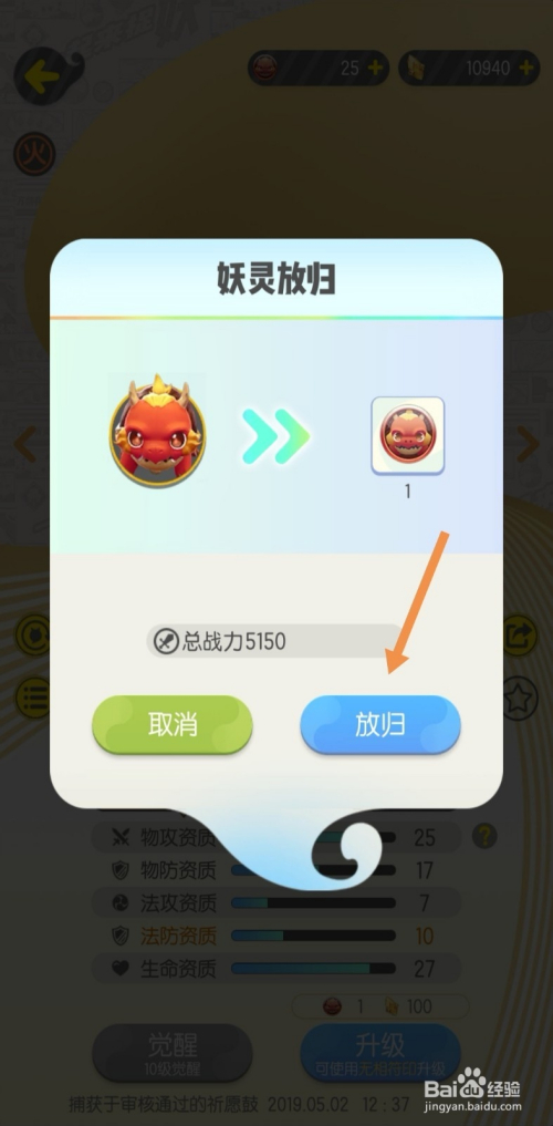在新呈现的页面中,点击选项“放归”,则放归该妖灵,并获得一个符印。