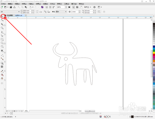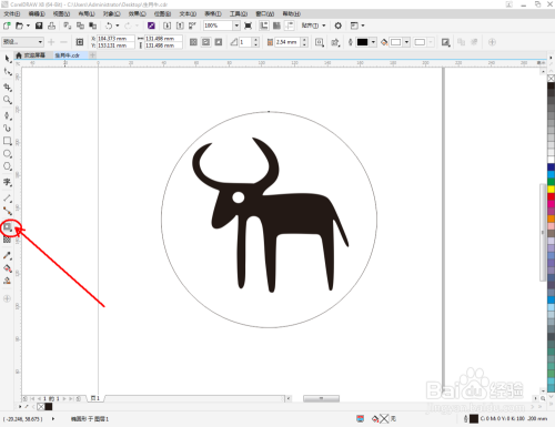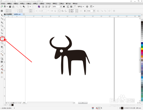 点击【钢笔东西】,在作图区域绘制一个生肖牛大致轮廓的多边图案。点击【卵形东西】,绘制出一个圆形图案,作为眼睛图案(如图所示);