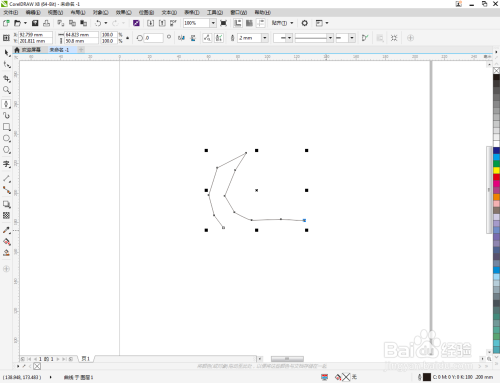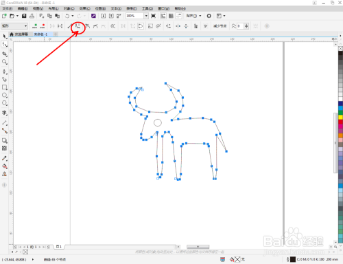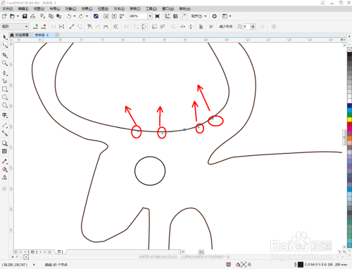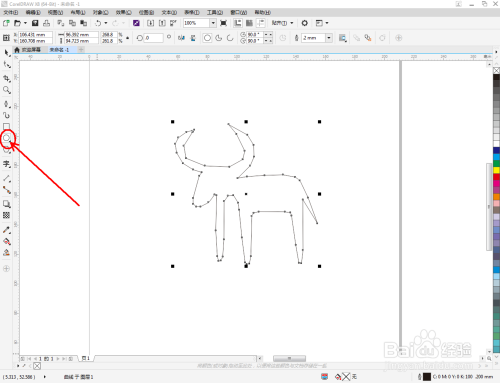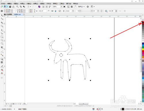 选中多边图案,点击【外形东西】,选中图案上的所有点,点击【转换为曲线】将图案转曲后,按图示调整节制点,完当作整个生肖牛轮廓图案的绘制(如图所示);