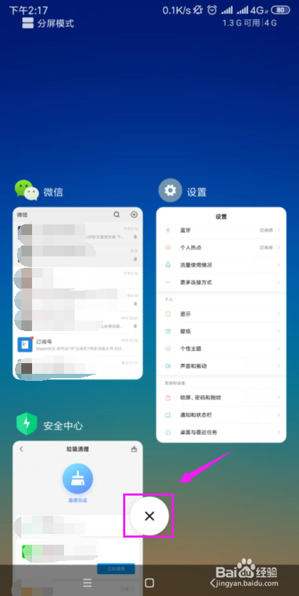 界面进入分屏模式,我们点下方的【×】,清理运行软件!
