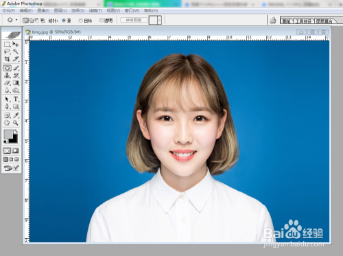 点选已经裁切好的小2寸照片:timg.jpg为当前文件,按下Ctrl键,并拖动照片到新建的5寸照片里面,松开鼠标,这样就把小2寸照片复制到了5寸照片文件里面,如下图