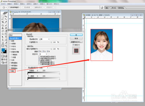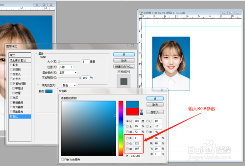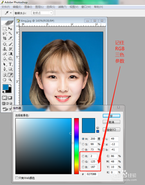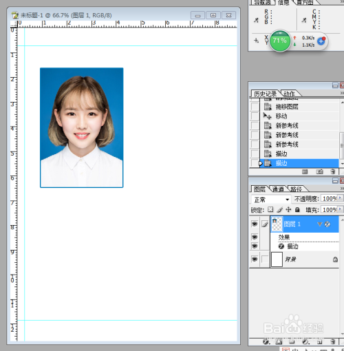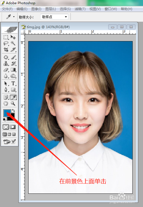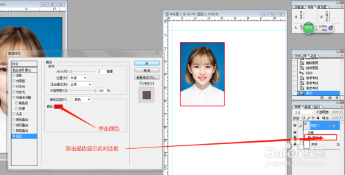 因为此照片的MM穿白色衣服,和白色布景无法区分,所以下面我采用描边的体例来画出照片的边缘,这一步在建造驾照等白底照片时也会用到(很是有效),操作方式如下图,拔取前景色为和照片布景色不异的颜色