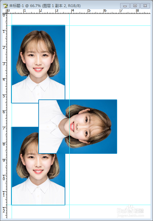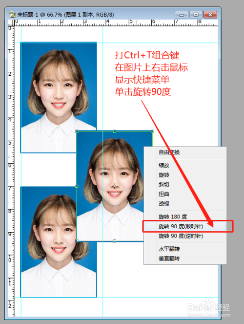 按下Ctrl+Alt+shift并在照片上面拖动鼠标再复制一张照片,按下Ctrl+T组合键,并在照片上面右击,扭转照片90度