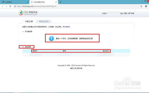 接着会呈现QQ恢复系统网页,会显示比来一个月内有没有退出群的名称 ,群号 退出时候.