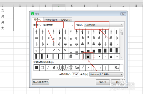 在符号对话框,在字体中选择“通俗文本”,在子集的下拉菜单下选择“几何图形符”,然后找到黑色实体方框,单击插入即可。